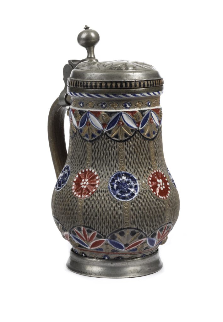 Freiberger Steinzeugkrug um 1670, mit zweifarbiger Emailbemalung und originalem Deckel von Samuel Günther d. Ä.