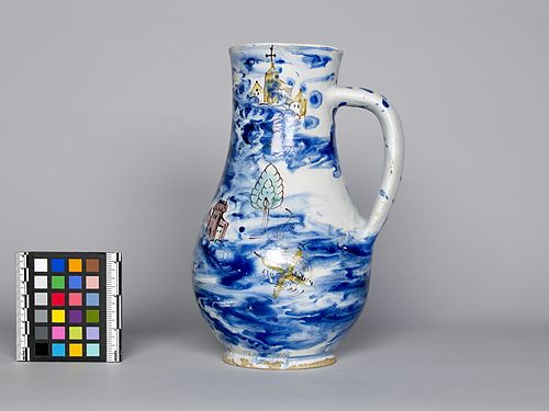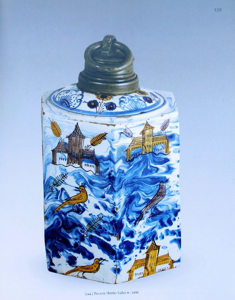 17th-century-haban-faience-jug-marbled-blue-white-birds-architecture