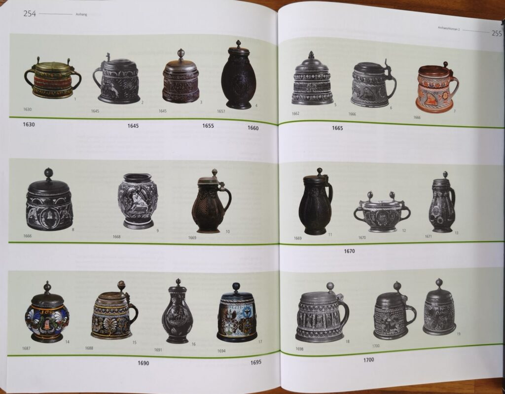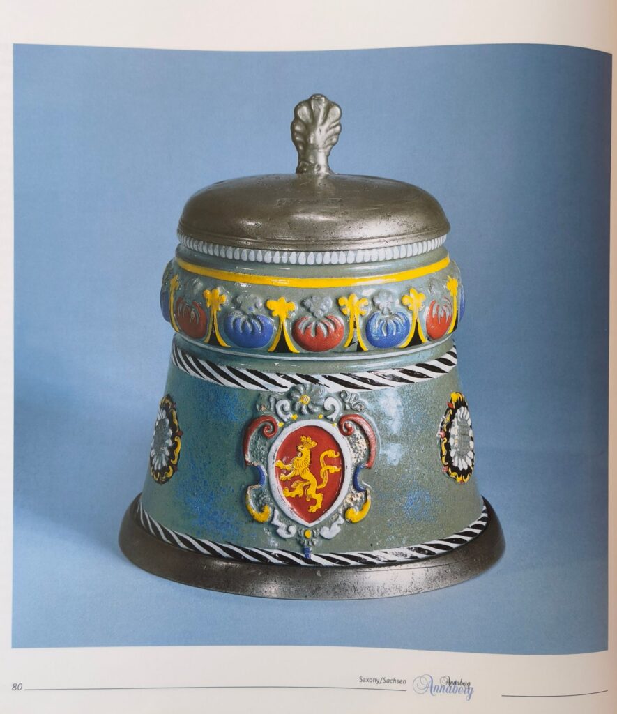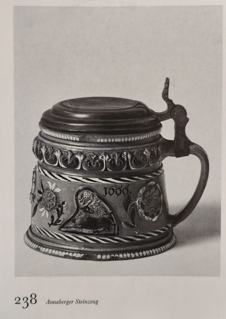Speculations on attributions of Dippoldiswalde stoneware since the middle of 19th century have been manifold. Ranging from mere speculations to serious research based on pewter marks and coat of arms to determin a place or origin. At the middle of 20th century Annaberg was most probable as the location of the productions of these ceramic objects. A very good description of the development of the attribution of Dippoldiswalde stoneware since the middle of the 19th century can be obtained by the standard reference Horschik Steinzeug p 217 ff (Horschik, Josef. Steinzeug: 15.-19. Jh.; von Bürgel bis Muskau. Ebeling, 1981.) So I do not want to go into this any further, as these longstanding discussions came to an end at the turn of the century with excavations that have been taking place in the Dippoldiswalde area and produced finds of “Annaberg type” molds and fragments. As a result the state of research as of today is that Dippoldiswalde is the origin of these stoneware objects formerly attributed to Annaberg.
