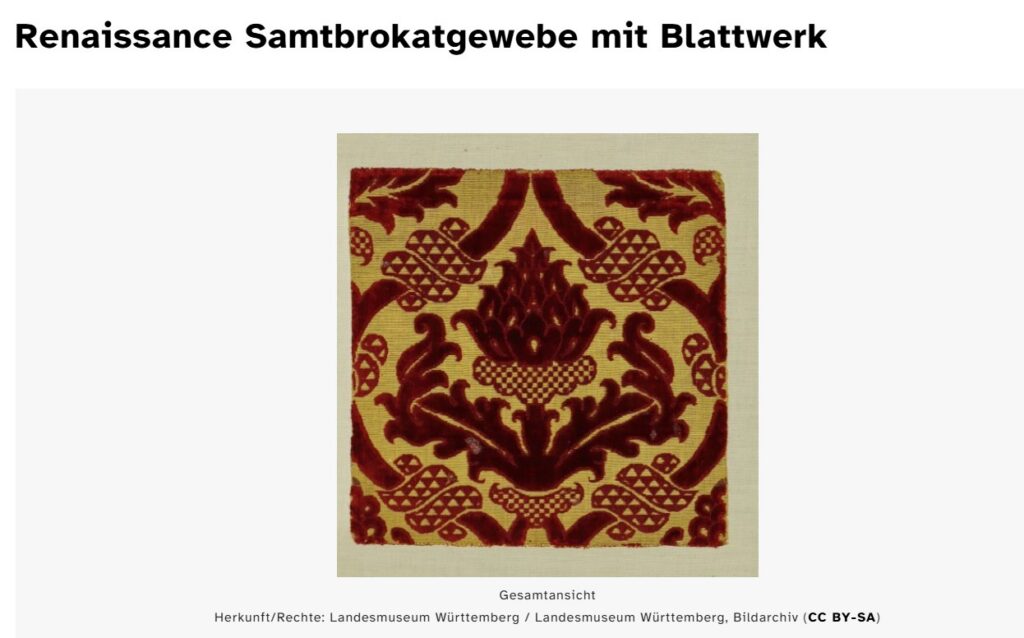 This long textile lineage makes the pomegranate appliqués on the Dippoldiswalde Posamentenkrug all the more legible: the Erzgebirge potters were not working in isolation but drawing on a pan-European ornamental vocabulary with roots stretching back through Renaissance silk-weaving to the medieval Orient — entirely fitting for a vessel whose very name honours the textile trade.