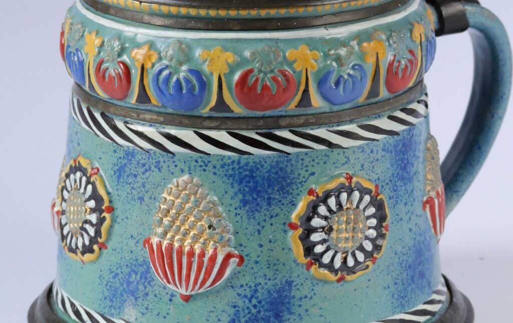 6. Krug (1666) Steinzeug, Engobe, darüber türkisgrüner Fond, drei große und zwei kleine Blattrosetten, zwei liegende Hirsche, Blüten auf Randwulst, Emailfarben. Jahreszahl 1666, Zinnmonzierung mit Stadtmarke C Crimmitschau, Höhe 17,5 cm (Standort: Nürnberg, Sammlung Porst, Inv-Nr. 177, Quelle: Horschik 1978, 411 Nr. 119)
