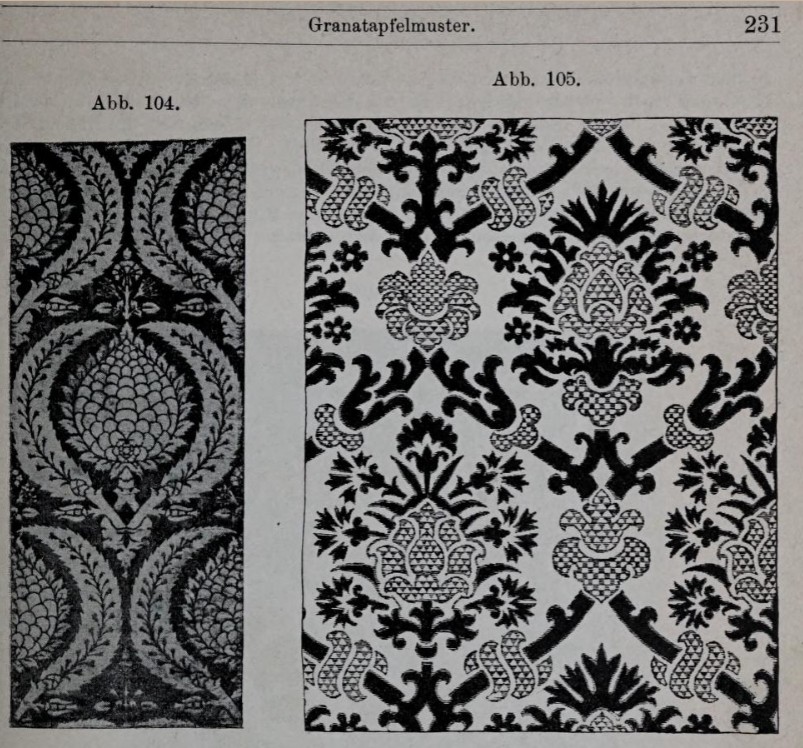 The pomegranate pattern (Granatapfelmuster) has one of the longest decorative histories in European applied arts. Its origins lie in antiquity, where the fruit carried strong symbolic resonance, traceable through Coptic textile fragments and into the woven silks of 14th-century Italy, where it developed under sustained Arab influence.
