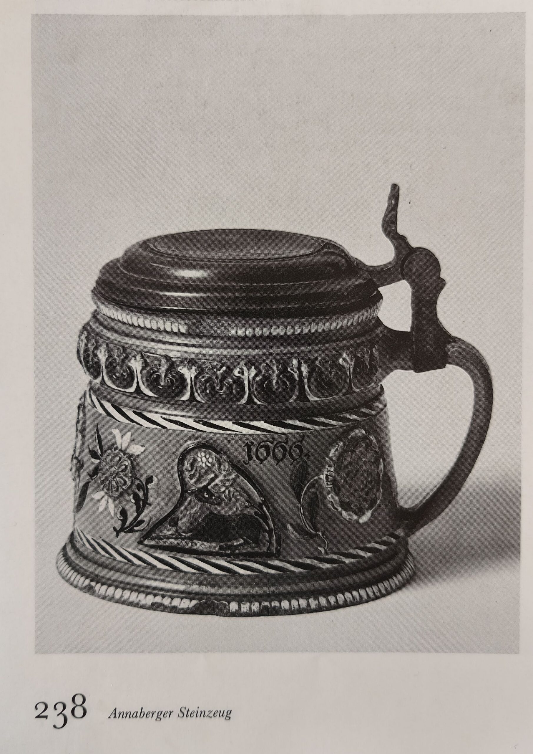119/ Krug, leicht konisch; eingezogener Lippenrand, Gurtfurche in Randzone und unter Reliefwulst, konischer Standring mit Gurtfurche, Bandhenkel. Steinzeug mit Braunsteinengobe und Salzglasur, darüber türkisgrüner Fond. Reliefdekor: drei große und zwei kleine Blattrosetten, zwei liegende Hirsche; stilisierte Blüten auf Randwulst. Emailfarben: Türkis-grün, Blau, Rot, Gelb, Weiß, Schwarz; gemalte Jahreszahl <<1666>». H. 11,5 cm, Annaberg um 1666. Zeitgen. Zinnmontierung mit Stadtmarke C = Crimmitschau/Erzgeb. Nürnberg. Slg, Porst, Inv. Nr. 177