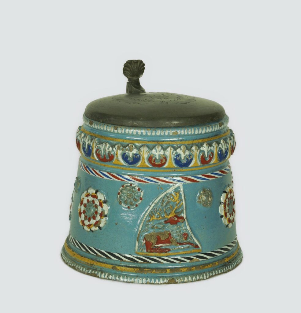 7. Krug (1666) Steinzeug, Engobe, Glasur, Emailbemalung, hellblaue Grundierung, Hirsche, Blüten, Akanthusblattfries, gemalte Datierung 1666″, Zinnmontierung eingravierte Datierung 1692. Höhe 11,5 cm (Standort: Grassimuseum Leipzig I-N1908.93)