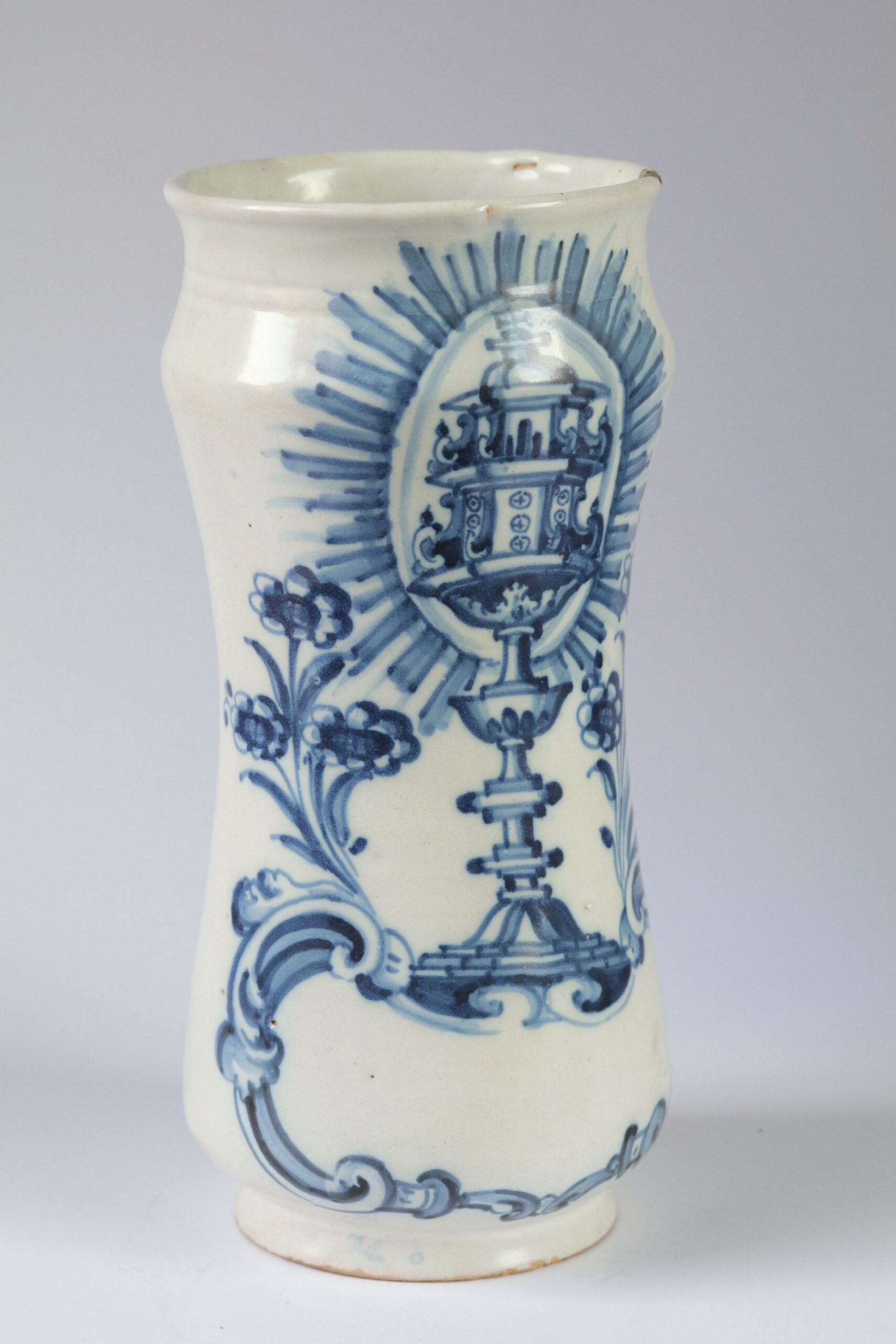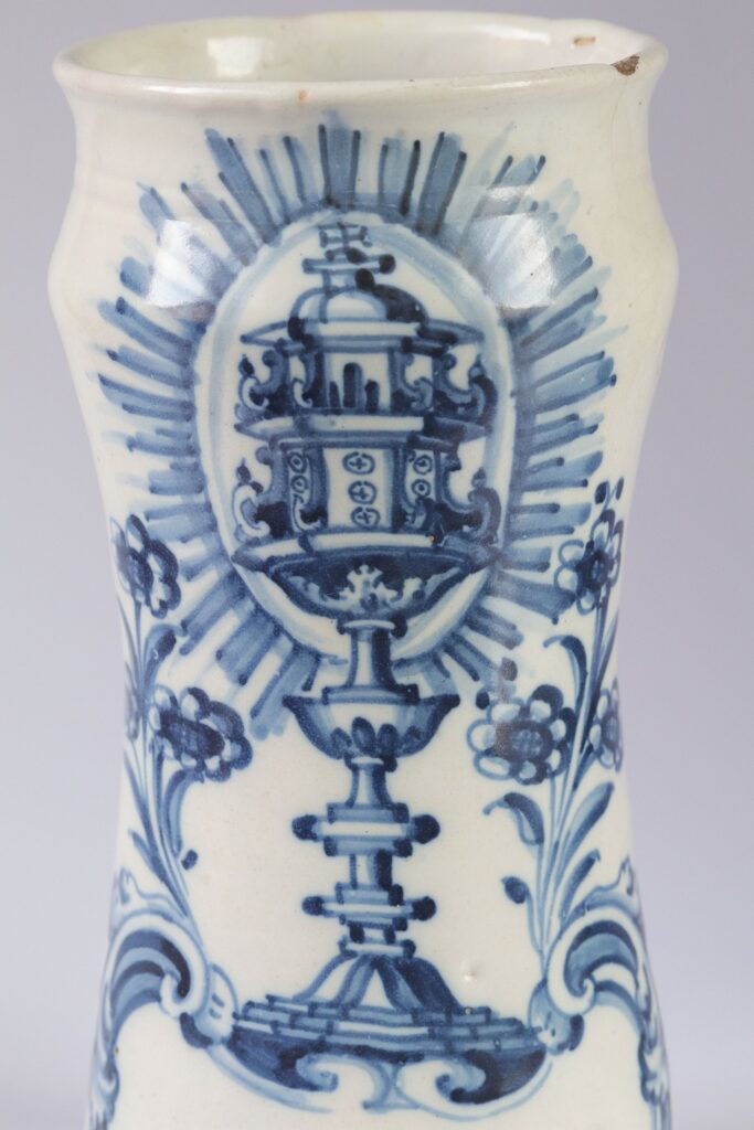 18th century Talavera Apothecary Jar and the Miracle of the Sacred Hosts of Alcalá de Henares.