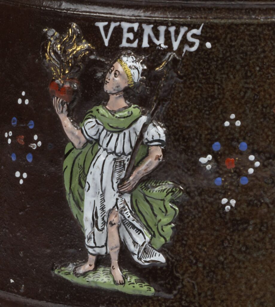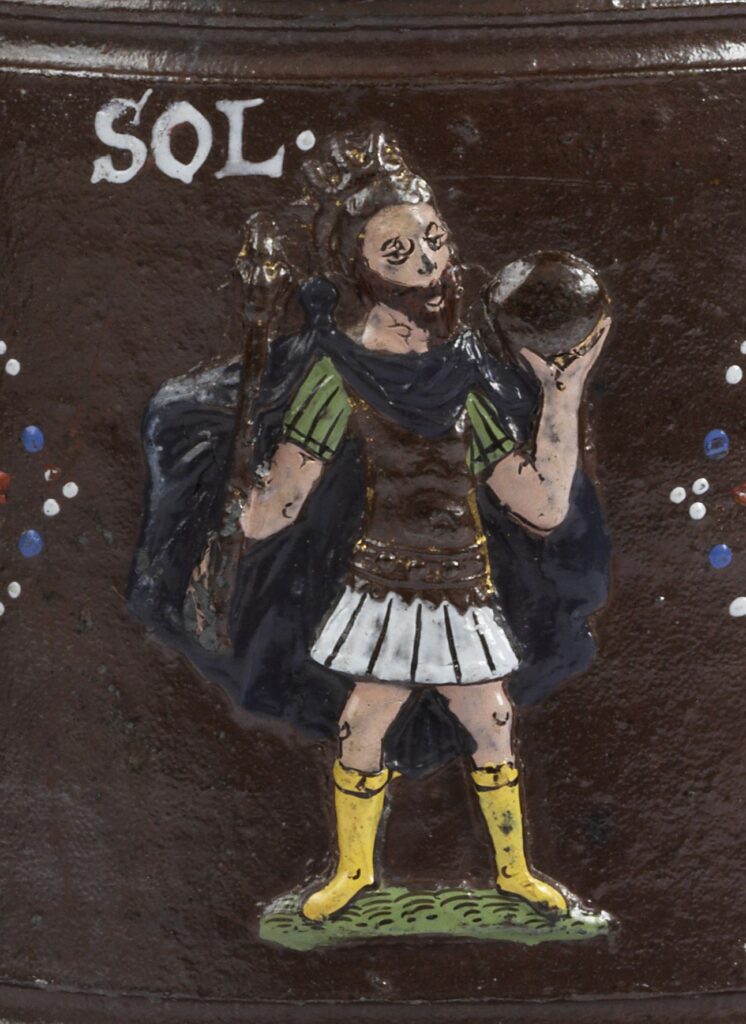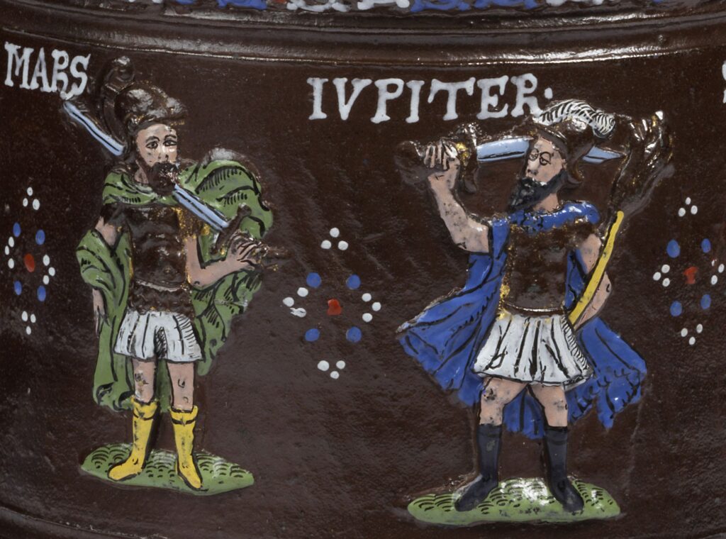 The body is encircled by two decorative friezes of foliated scrollwork and interlaced relief applications painted in polychrome enamels displaying the seven planets in the form of their presiding Roman deity figures.