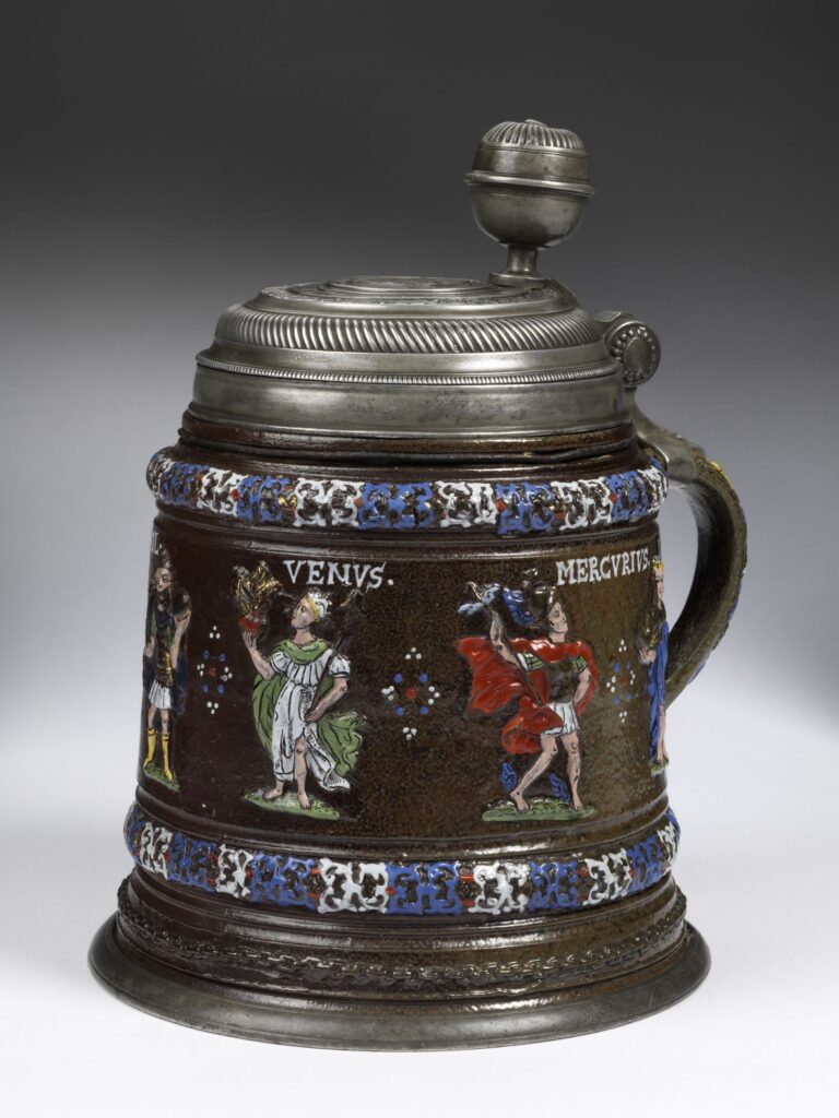 The postures, attributes and even the costumes of the relief figures on the tankards correspond closely to the iconographic language of early sixteenth-century printmaking, filtered through the conventions of the applied relief-mould workshop.